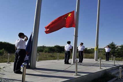 伴隨著廣播介紹大連海事大學與錦州航星集團校企合作的深厚情誼,我們全班和集團所有員工已經整齊的站在了國旗前,等待著國旗升起的莊嚴時刻。